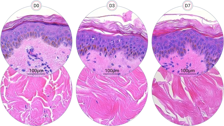 Since it is real human skin, NativeSkin® has the same structure and composition as in vivo human skin. It presents a mature stratum corneum and normal skin barrier function and their integrity can be preserved for 7 days. After 7 days of culture, experimental data may show higher variability but NativeSkin® remains viable. Hematoxilin & Eosin staining shows mature stratum corneum, a dermal-epidermal junction that comprises the key features of the dermal-epidermal junction of real human skin, with a preserved basal layer and rete ridges. The images also illustrate that dermis integrity is preserved for 7 days.