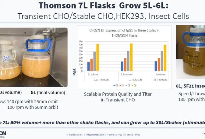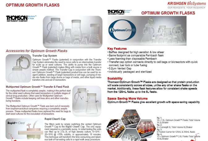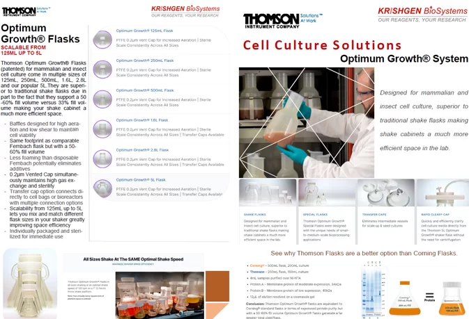 Thomson manufactures Optimum Growth® Flasks for high-yield mammalian and insect cell cultures with enhanced aeration and Ultra Yield® Flasks designed for microbial cultures, offering up to 10 times higher growth and productivity compared to standard flasks. Both types optimize oxygen transfer and nutrient exchange for superior culture performance.