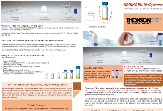 This video shows the simple 3 step process of using the Thomson Filter Vial. Thomson’s filtration products are engineered and optimized to increase the efficiency of sample preparation without compromising the results. Our filter vials are manufactured with attention to detail and high-grade quality to ensure performance at optimal levels. Our filter vials find a wide variety of applications ranging from life sciences, drug discovery, monitoring and analysis. They are universal for all different types of autosamplers including UHPLC. Thomson Filter Vials come in a variety of membranes such as PVDF, PTFE, PES, and Nylon. Also they come in .2uM and .45uM.