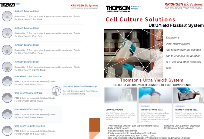 Thomson manufactures Optimum Growth® Flasks for high-yield mammalian and insect cell cultures with enhanced aeration and Ultra Yield® Flasks designed for microbial cultures, offering up to 10 times higher growth and productivity compared to standard flasks. Both types optimize oxygen transfer and nutrient exchange for superior culture performance.